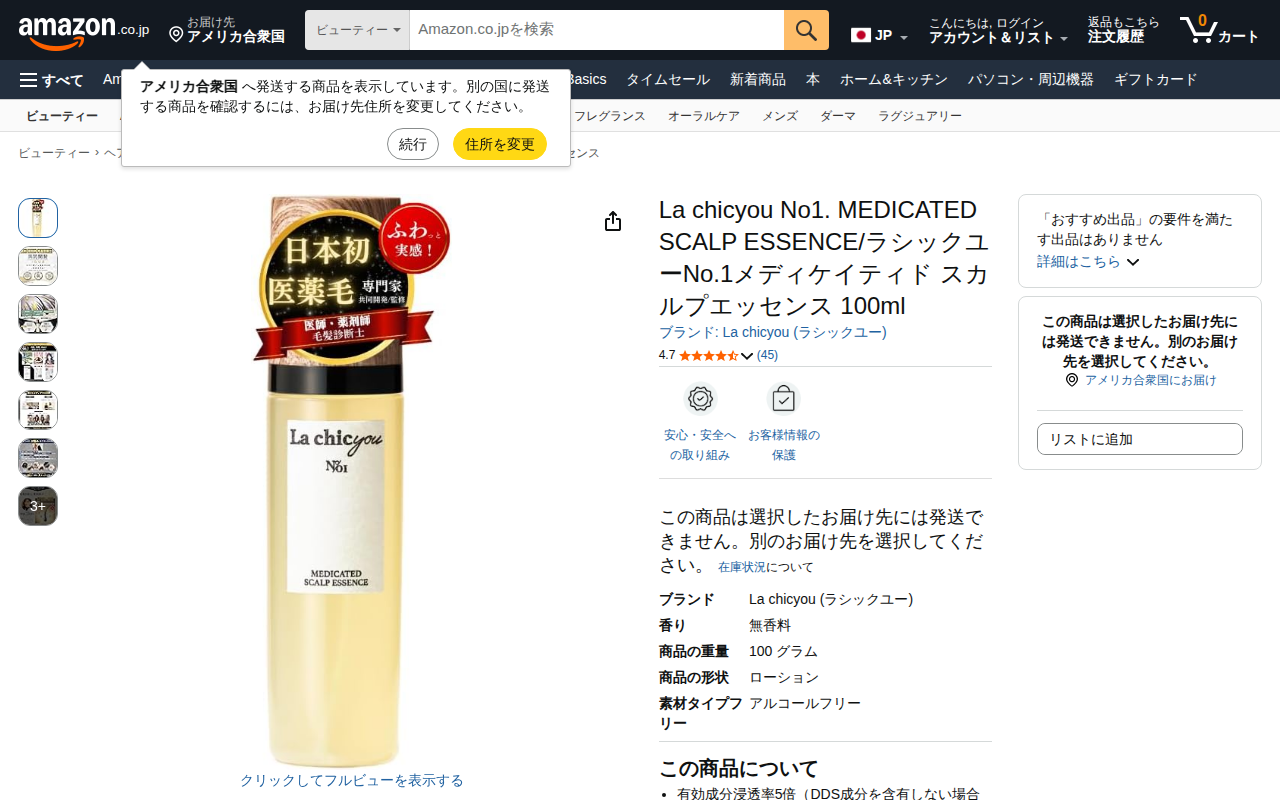 This page displays a product listing on Amazon for La chicyou's Medicated Scalp Essence, a 100ml hair tonic an...