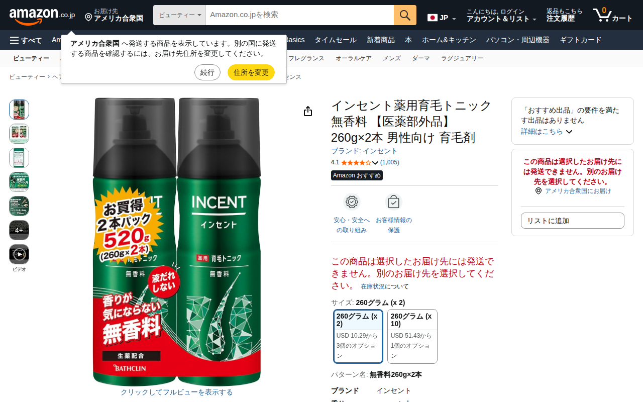 This page features Inseent medicated hair tonic (unscented), a men's hair growth product sold as a quasi-drug ...