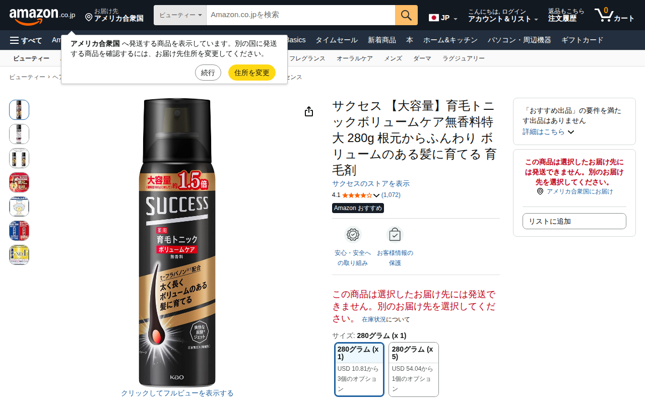 This page is an Amazon product listing for Success Hair Tonic 280g, an unscented volumizing care product. It i...