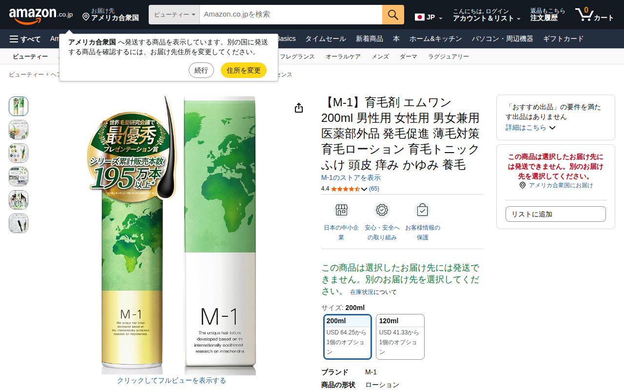 This page is an Amazon product listing for M-1 hair growth tonic, a 200ml medicated cosmetic product for men, ...