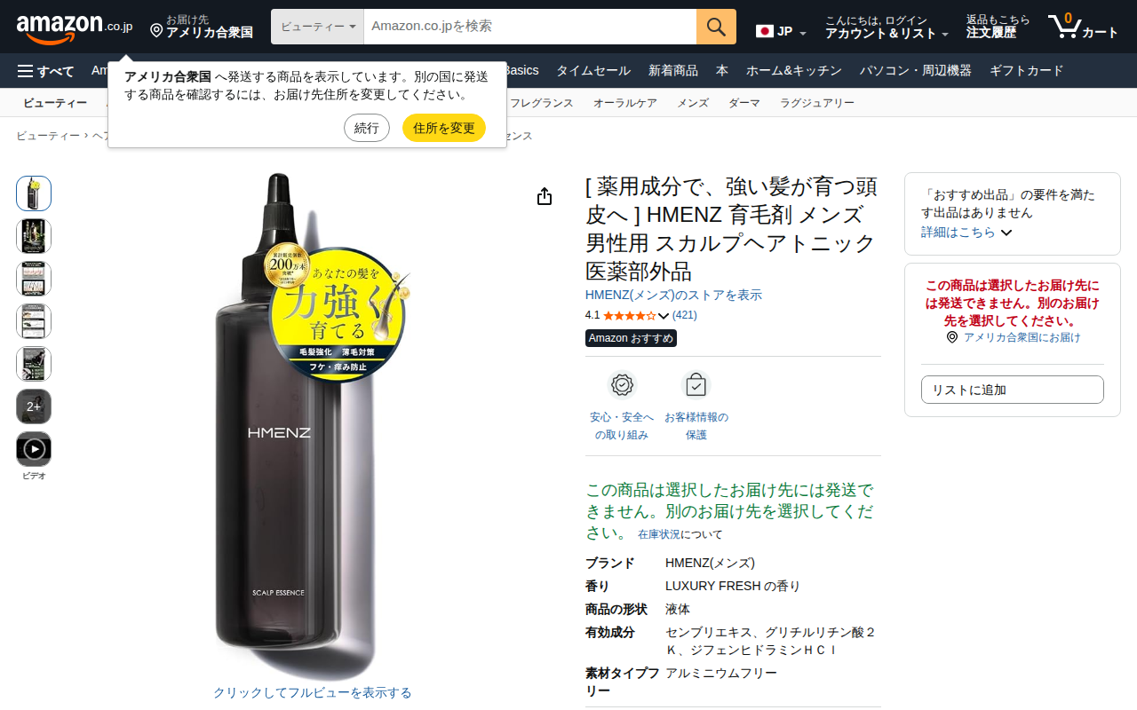This page is an Amazon product listing for HMENZ Men's Scalp Hair Tonic, a quasi-drug hair growth product. It ...