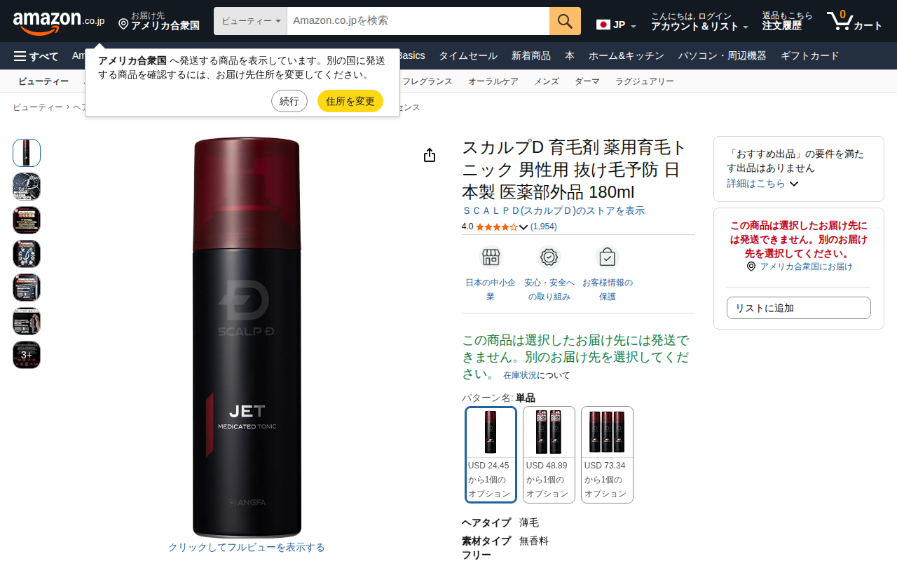 This page presents ScalpD Medicinal Hair Growth Tonic for men, a 180ml hair care product. As a quasi-drug, it ...