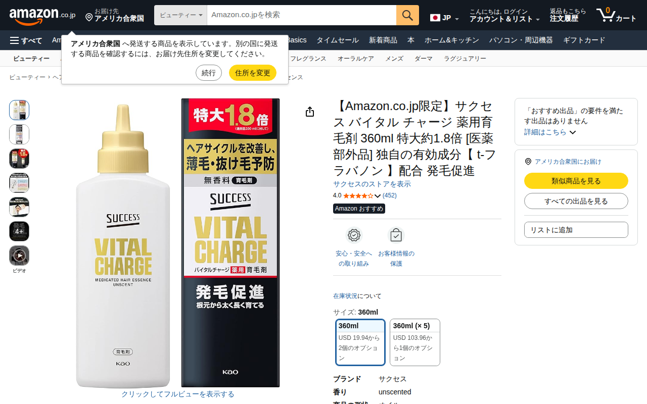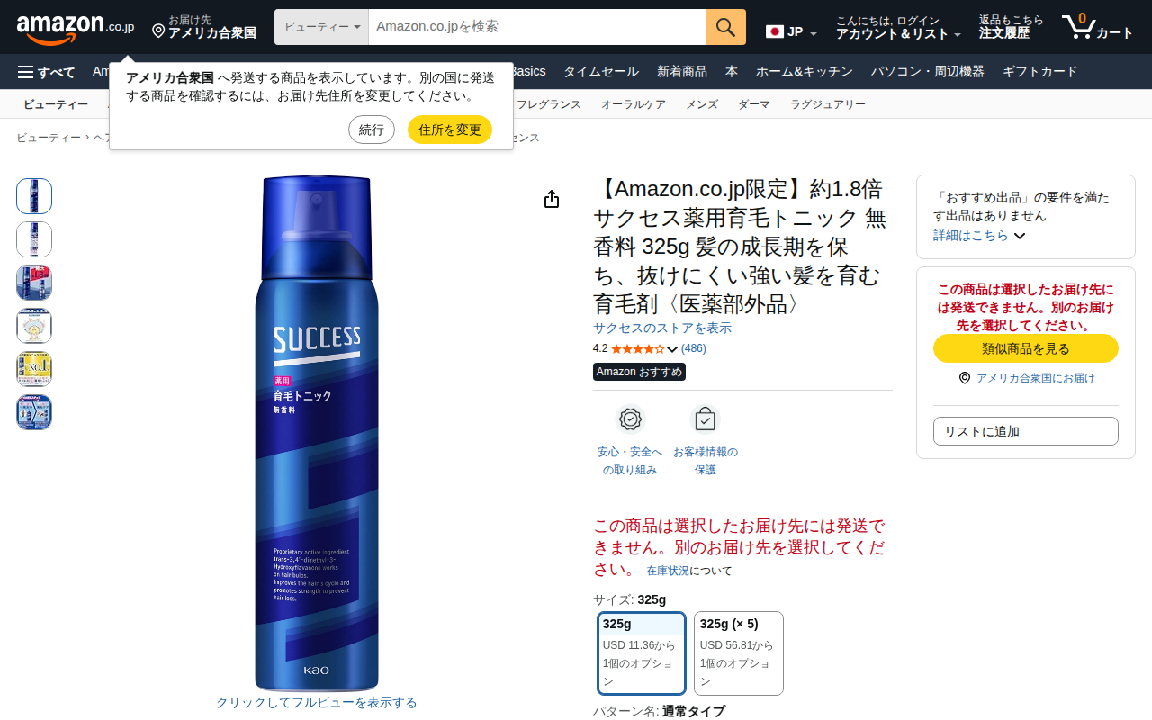 This page displays the Amazon.co.jp exclusive Success medicated hair tonic (unscented, 325g). As a quasi-drug ...