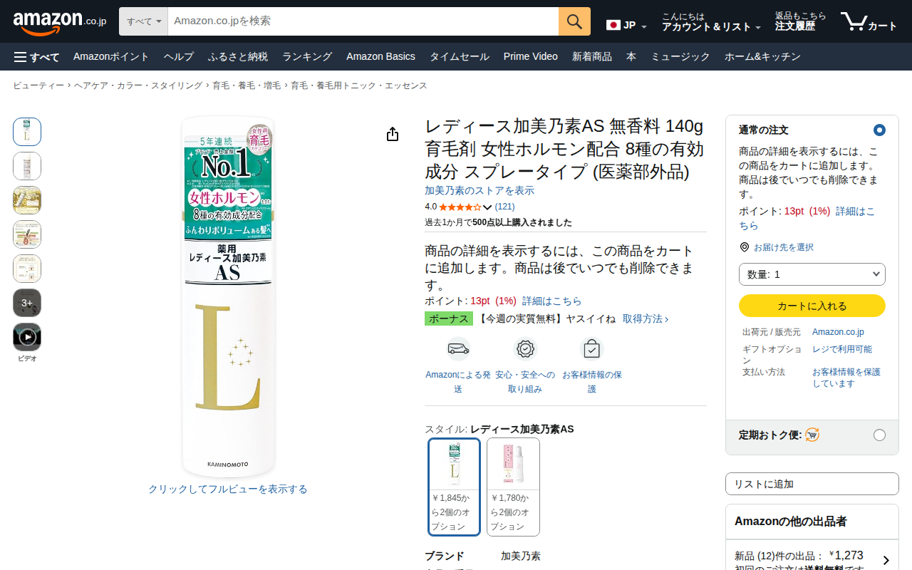 加美乃素AS 無香料 140g スプレー 女性ホルモン配合 育毛剤女性向け
