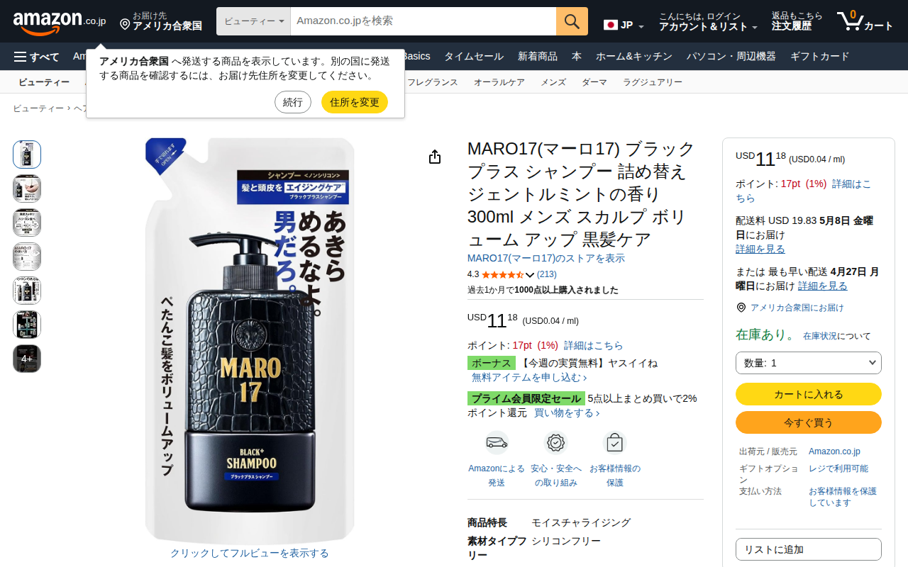 This page presents the MARO17 Black Plus Shampoo Refill product on Amazon. It is a 300ml men's scalp shampoo w...