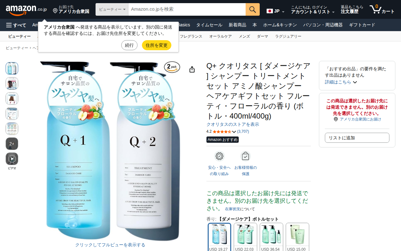 This page showcases the Q+ Qualitas Damage Care Shampoo and Treatment Set on Amazon. The set includes 400ml sh...