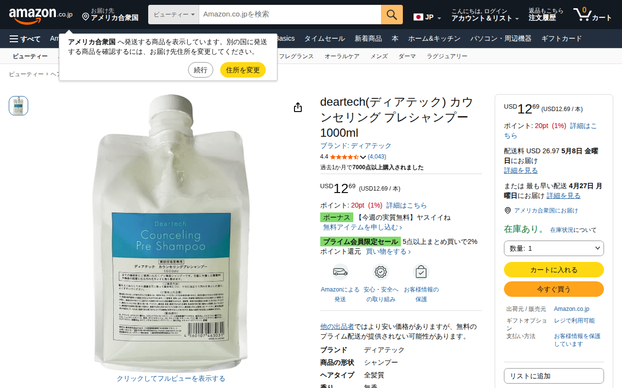 This page presents the Deartech Pre-Shampoo 1000ml refill product on Amazon.co.jp. Priced at USD 12.69 with 1%...