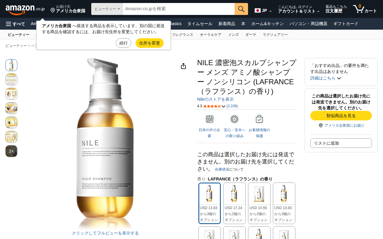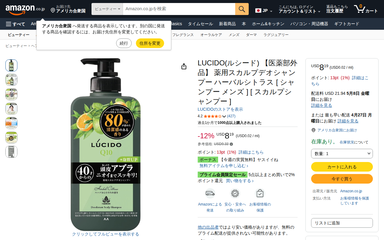 This page is an Amazon.co.jp product listing for LUCIDO Medicated Scalp Deodorant Shampoo for men with herbal ...