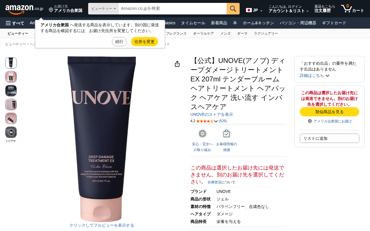 This page showcases UNOVE Deep Damage Treatment EX, a hair treatment product available on Amazon. It contains ...