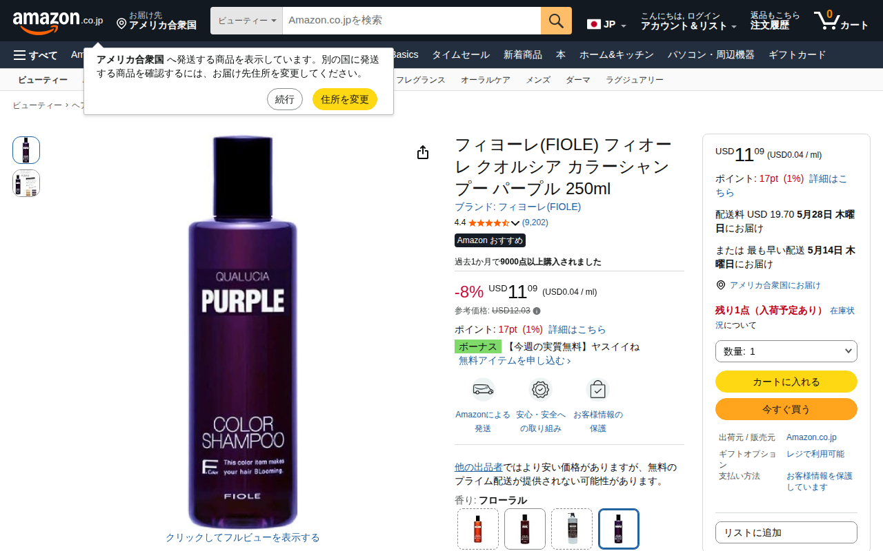 This page is an Amazon.co.jp product listing for Fiole Quorcia Color Shampoo in Purple, 250ml. It is categoriz...
