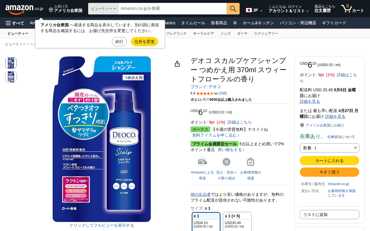 This page displays the Deoco Scalp Care Shampoo refill 370ml on Amazon.co.jp. Priced at USD 6.10 (USD 0.02 per...