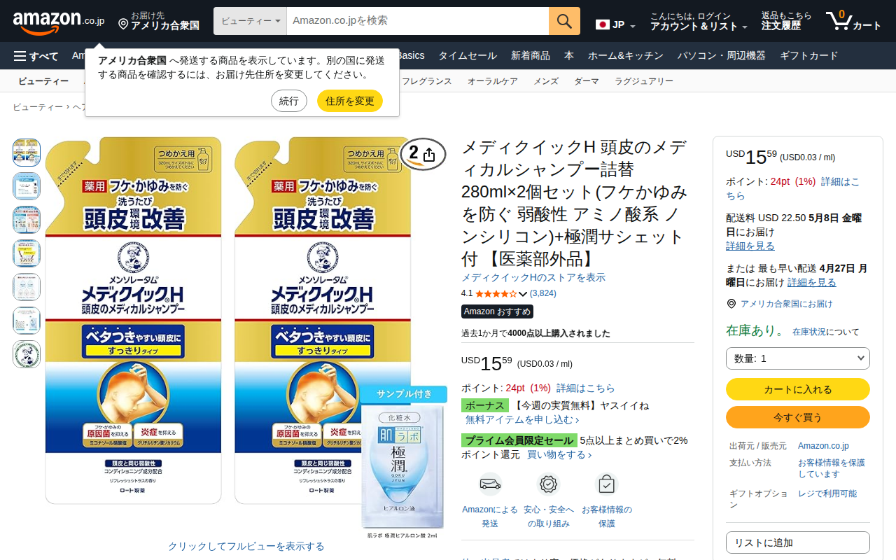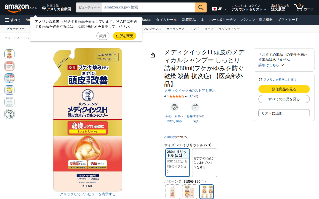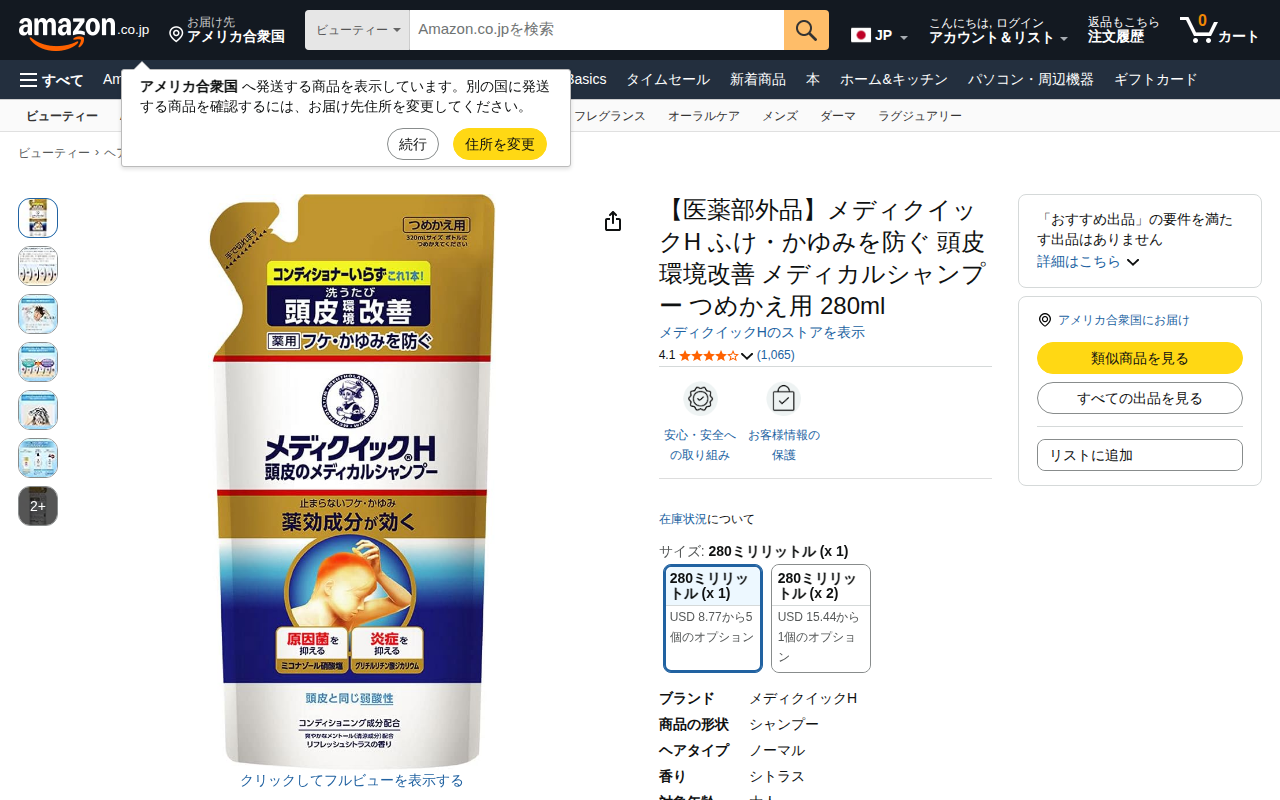 This page presents the Amazon product listing for Medicquick H Scalp Medical Shampoo Refill (280ml x 2). It is...