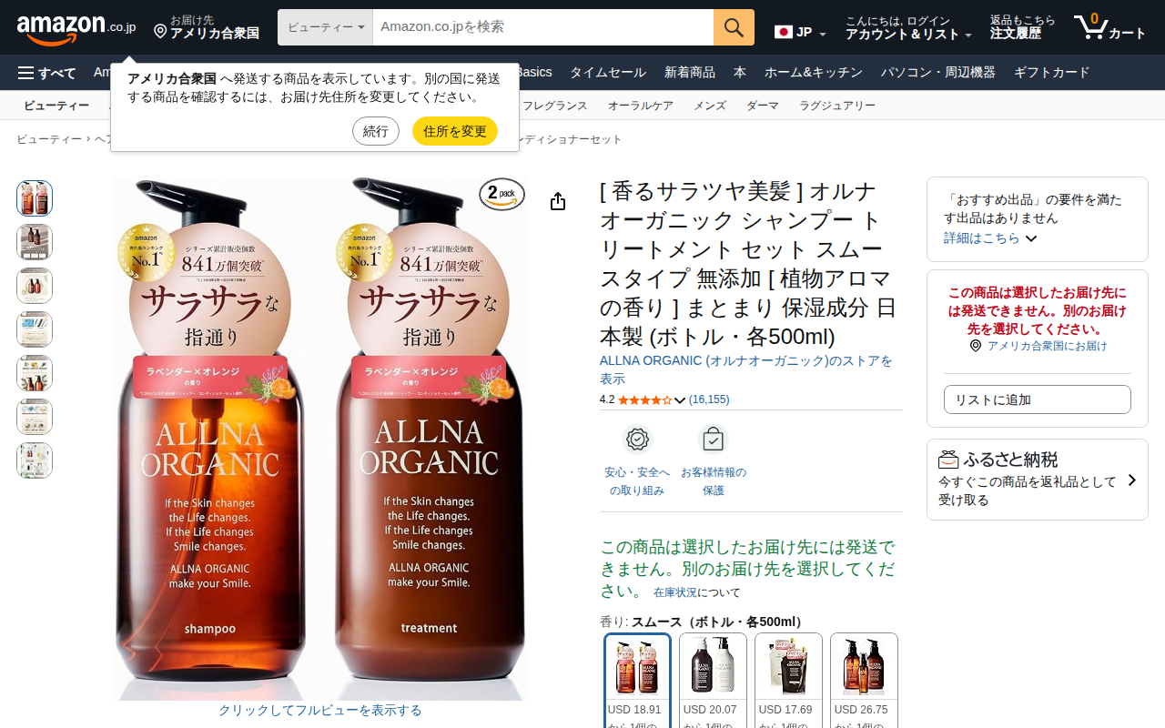 This page presents ALLNA ORGANIC's shampoo and treatment set sold on Amazon. The smooth-type product comes in ...
