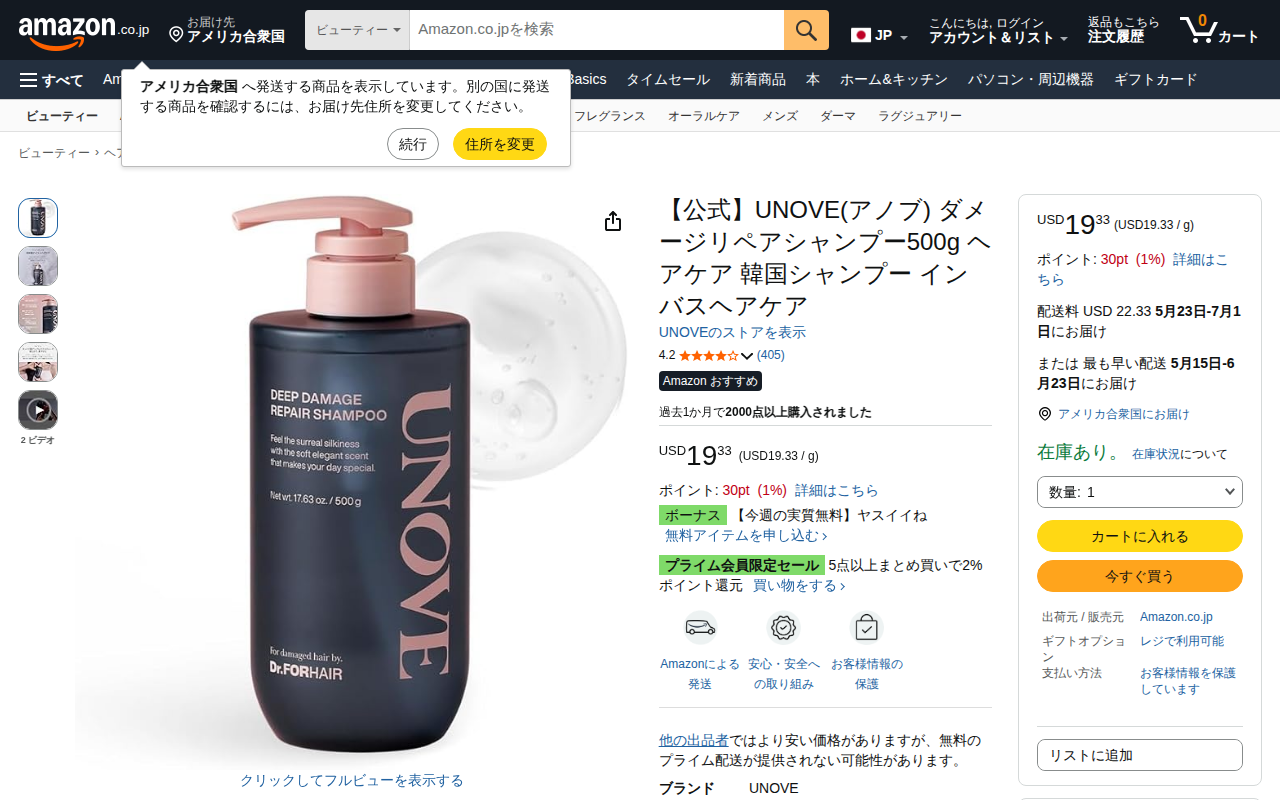 This page features the UNOVE Deep Damage Repair Shampoo on Amazon.co.jp, a Korean hair care product in 500g bo...