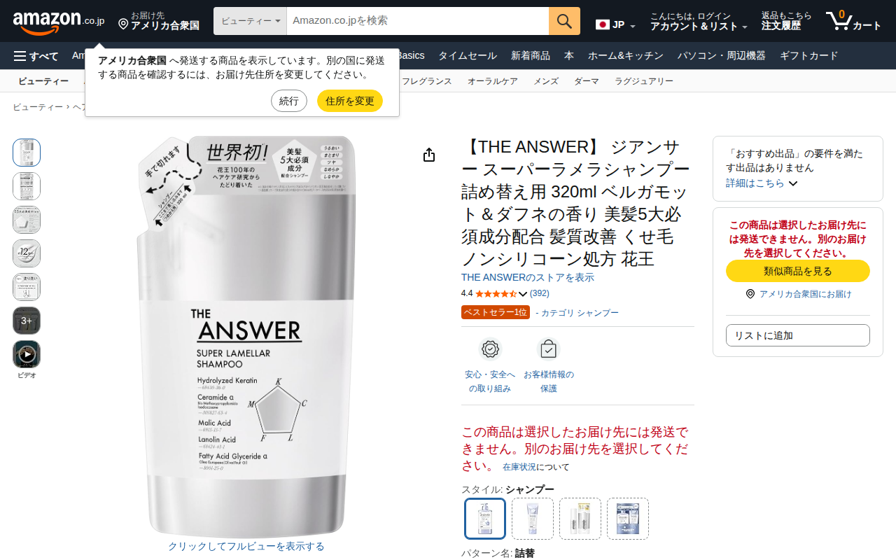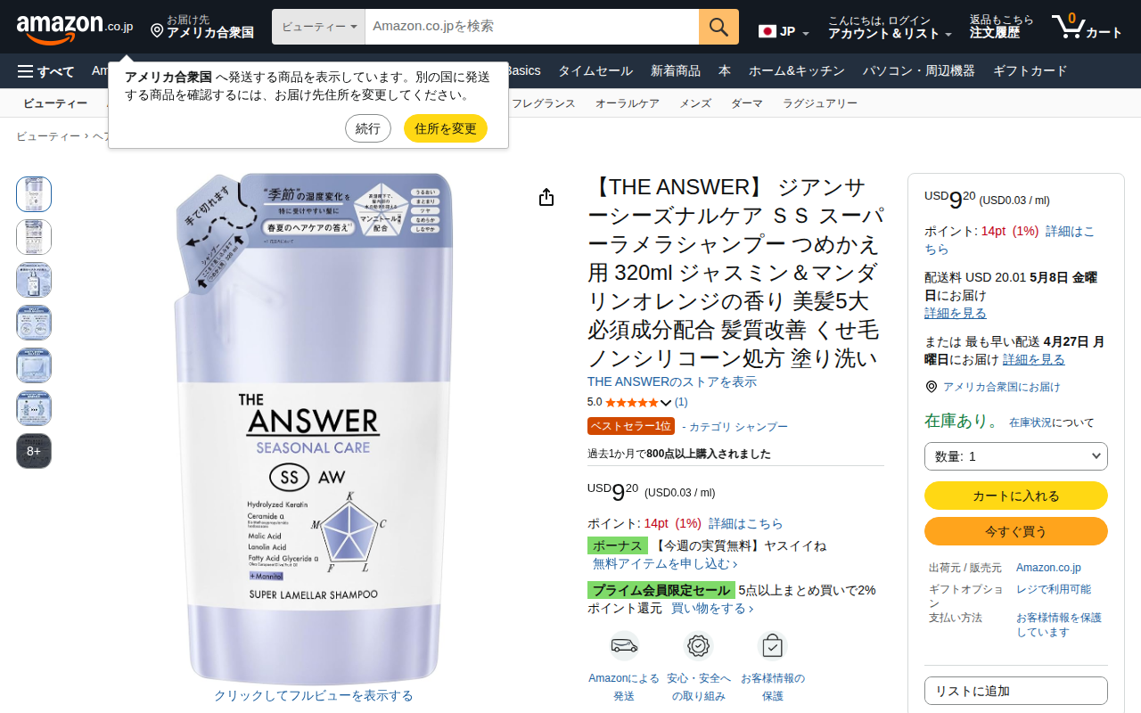 This page is the product listing for THE ANSWER Seasonal Care SS Super Lamella Shampoo refill (320ml) on Amazo...