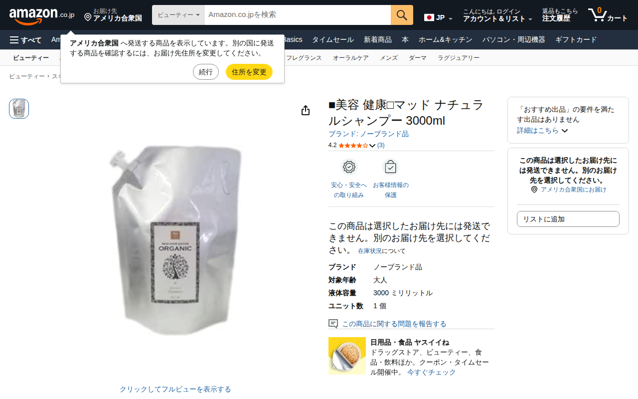This page displays a product listing on Amazon.co.jp for "Mud Natural Shampoo 3000ml." It is a non-branded adu...
