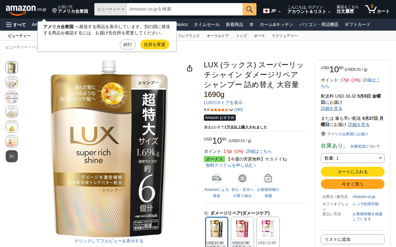 This page showcases the LUX Super Rich Shine Damage Repair Shampoo refill (1690g) on Amazon.co.jp. Priced at U...
