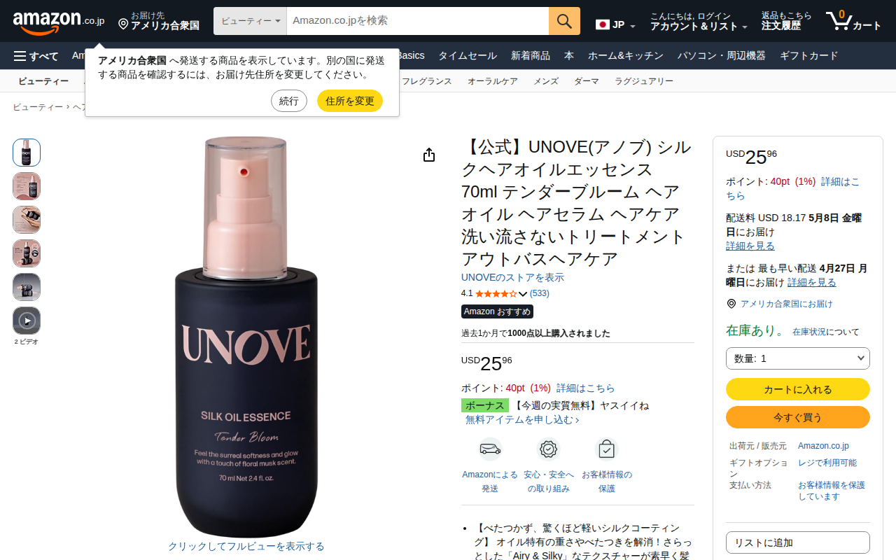 This page presents the UNOVE Silk Hair Oil Essence (70ml, Tender Bloom) sold on Amazon for USD 25.96, with 533...