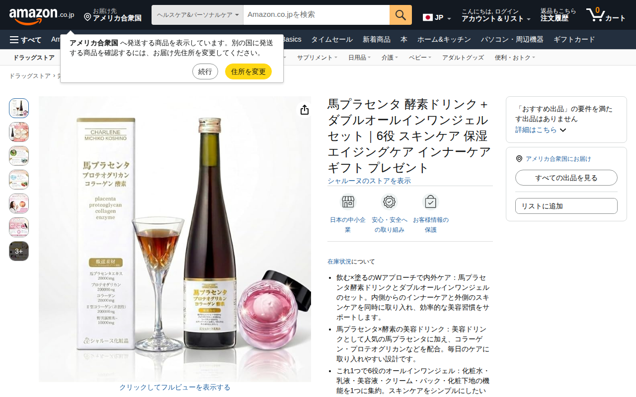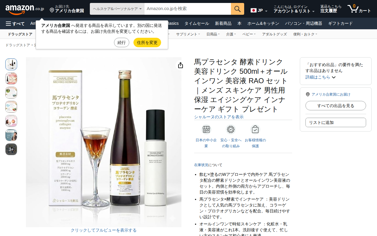 This page presents a beauty care set by Sharune brand, featuring horse placenta enzyme drink (500ml) and all-i...