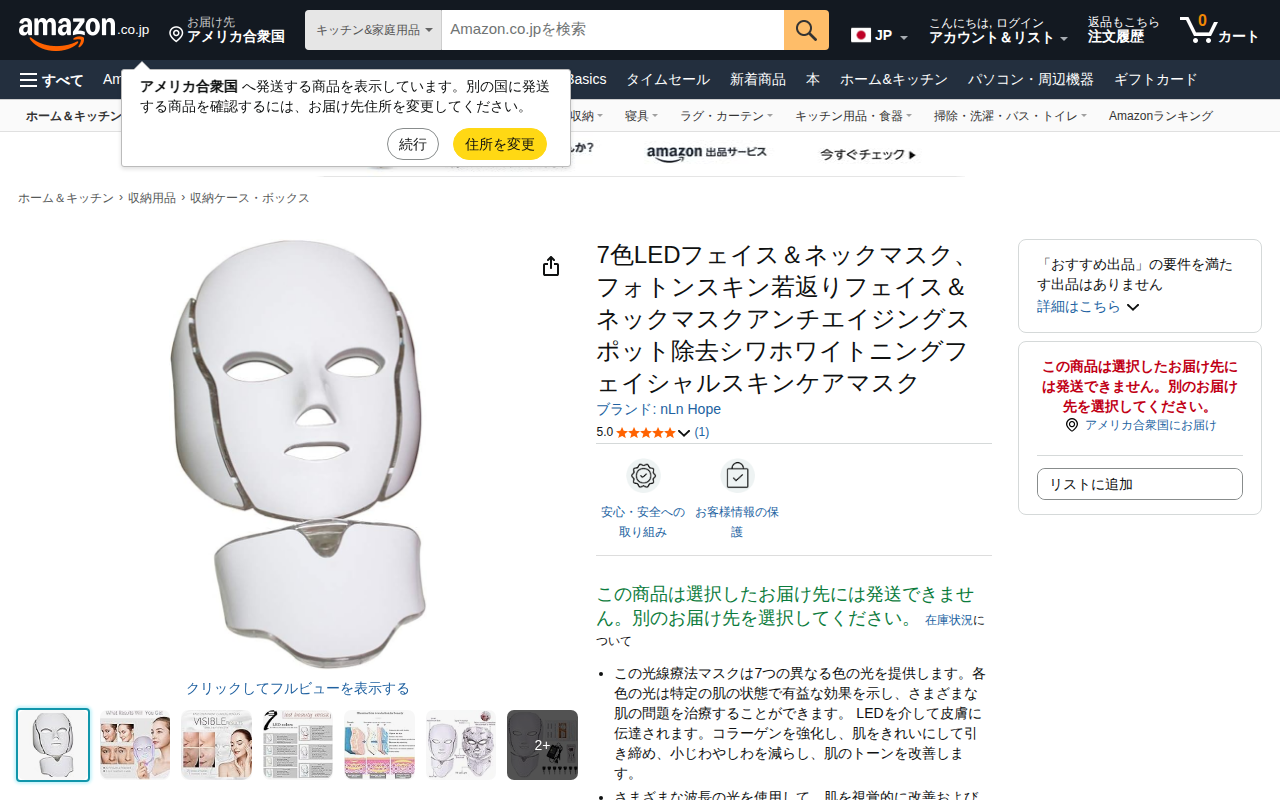 This page presents an Amazon product listing for a 7-color LED face and neck mask by nLn Hope. The photon ther...