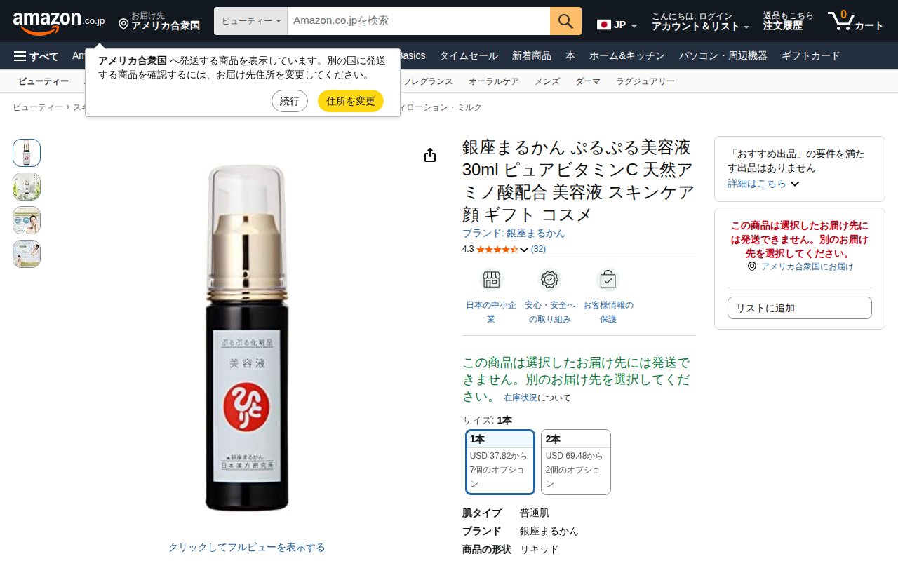 This page features the Ginza Marucan "Purupuru Beauty Essence" with Pure Vitamin C, a 30ml skincare product en...