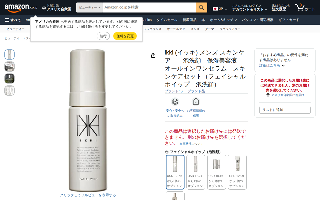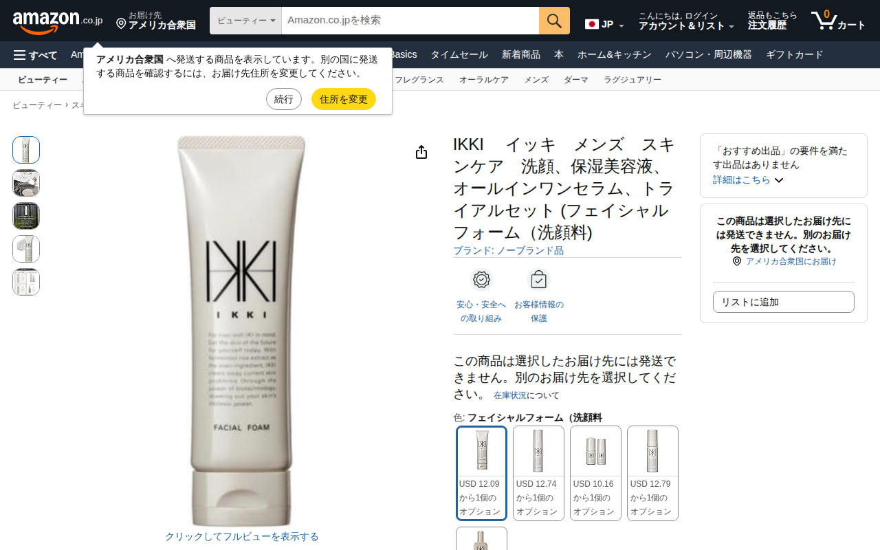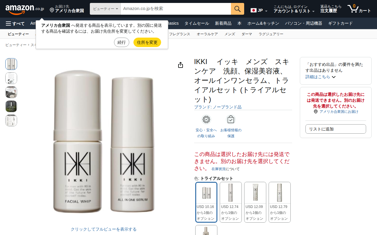 This page displays an IKKI men's skincare trial set on Amazon.co.jp, featuring a facial cleanser, moisturizing...
