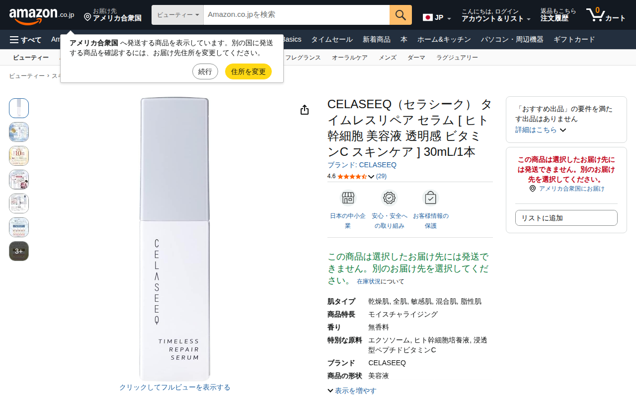 This page showcases the CELASEEQ Timeless Repair Serum on Amazon.co.jp, a 30mL beauty serum featuring human st...