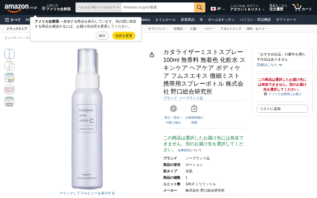 Amazon | カタライザーミストスプレー 100ml 無香料 無着色 化粧水 スキンケア ヘアケア ボディケア フムスエキス 微細ミスト 携帯用スプレーボトル 株式会社 野口総合研究所 | ノーブランド品 | 化粧水 通販