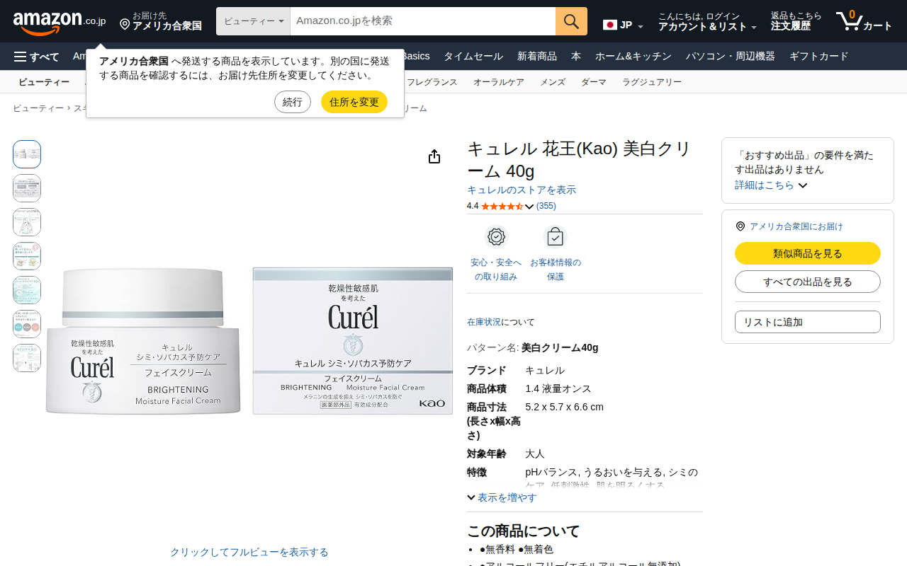 This page presents Curel Kao Brightening Cream 40g on Amazon.co.jp. It is a low-irritant moisturizing cream de...