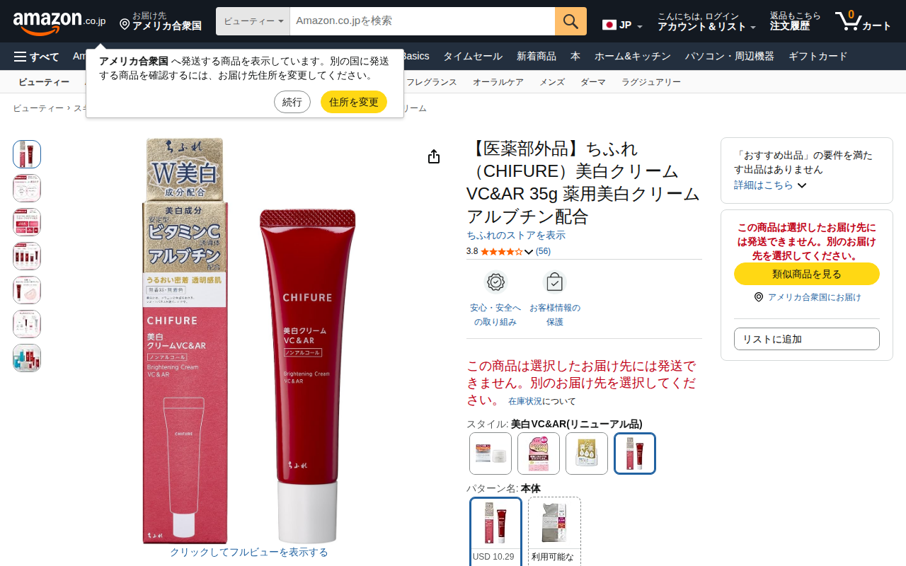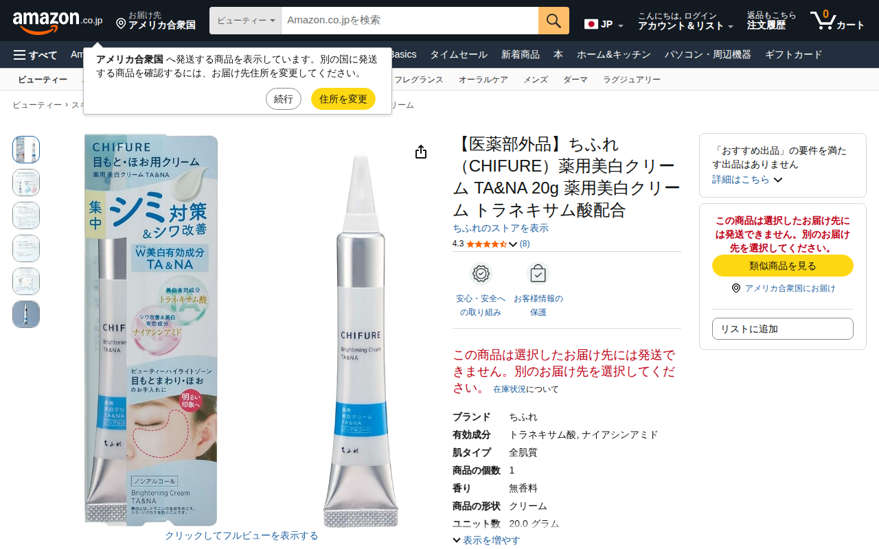 This page presents Chifure's medicated whitening cream TA&NA (20g) on Amazon. It contains two whitening active...