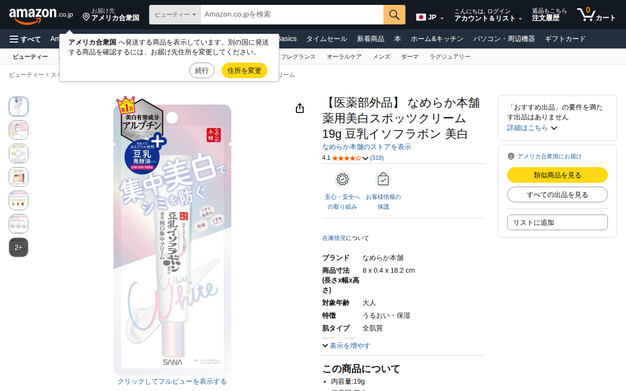 This page presents an Amazon listing for Namerakahonjiten's Medicated Whitening Spot Cream (19g), containing s...