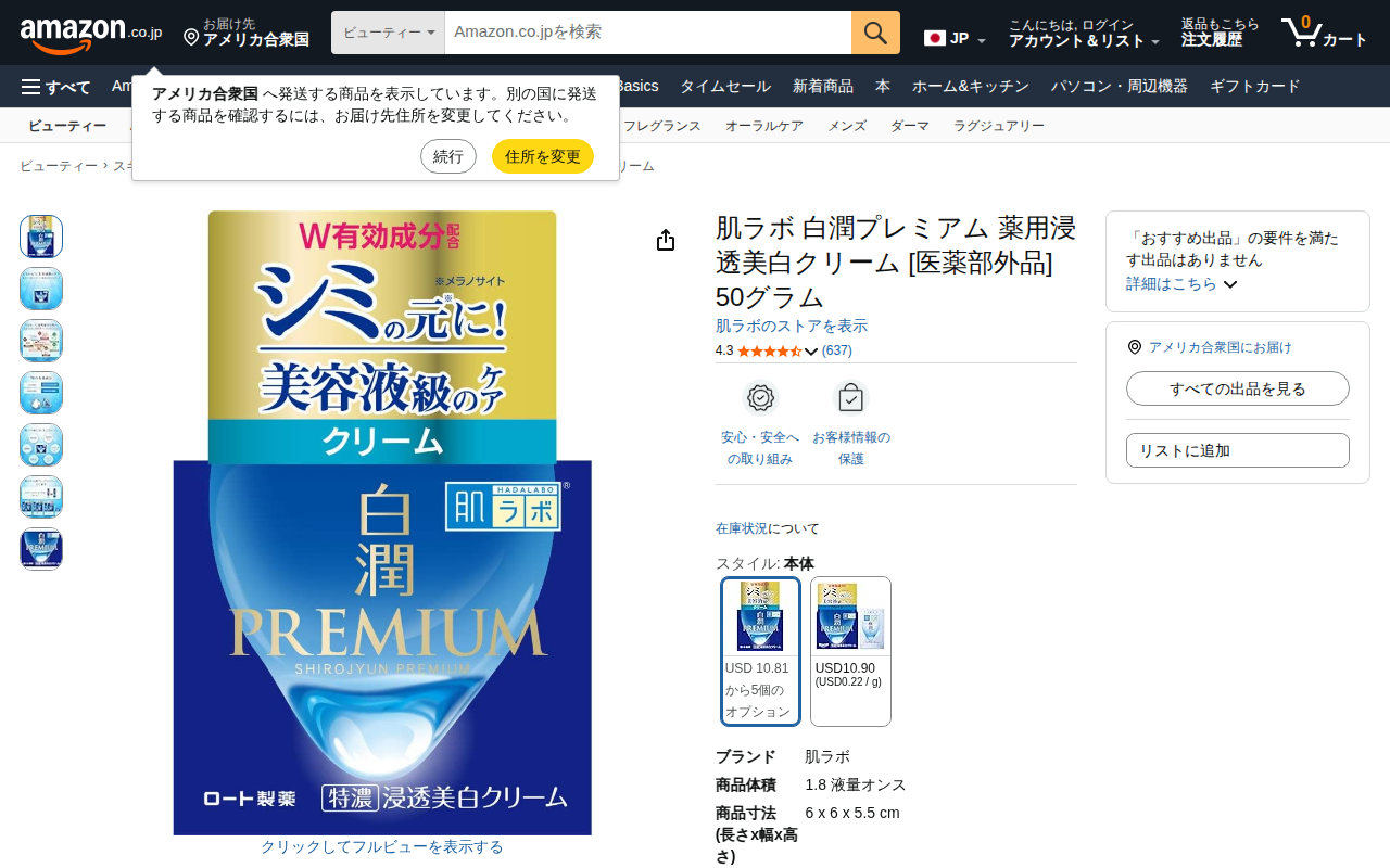This page displays a Hadalabo Shirojyun Premium medicated whitening cream product on Amazon.co.jp. The 50-gram...