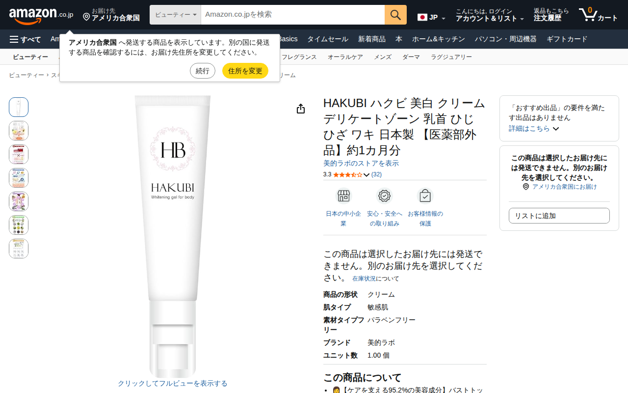 This page displays an Amazon.co.jp product listing for HAKUBI whitening cream, a quasi-drug designed for sensi...