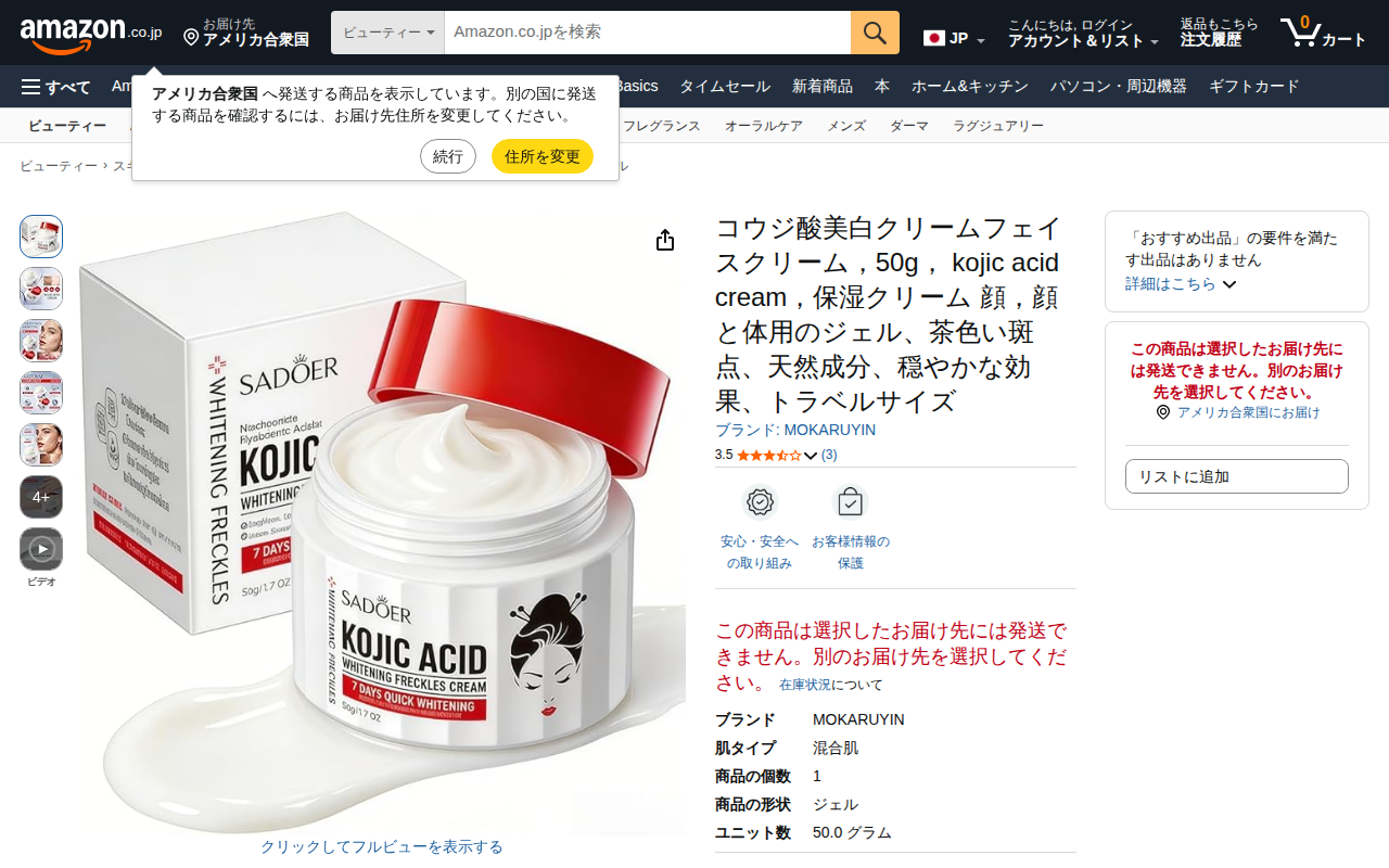 This page features a kojic acid brightening cream facial gel by MOKARUYIN on Amazon. The 50g travel-size produ...