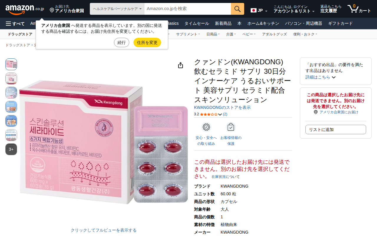 This page features KWANGDONG's "Drinkable Ceramide Supplement 30-day supply" on Amazon. It is an inner-care be...