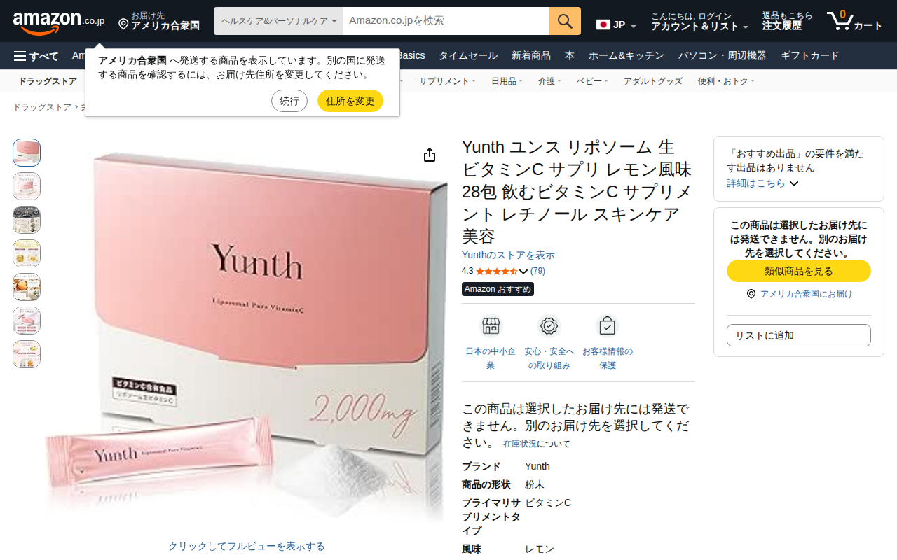 This page features Yunth's liposomal raw vitamin C supplement in lemon flavor (28 packets). It contains high-c...