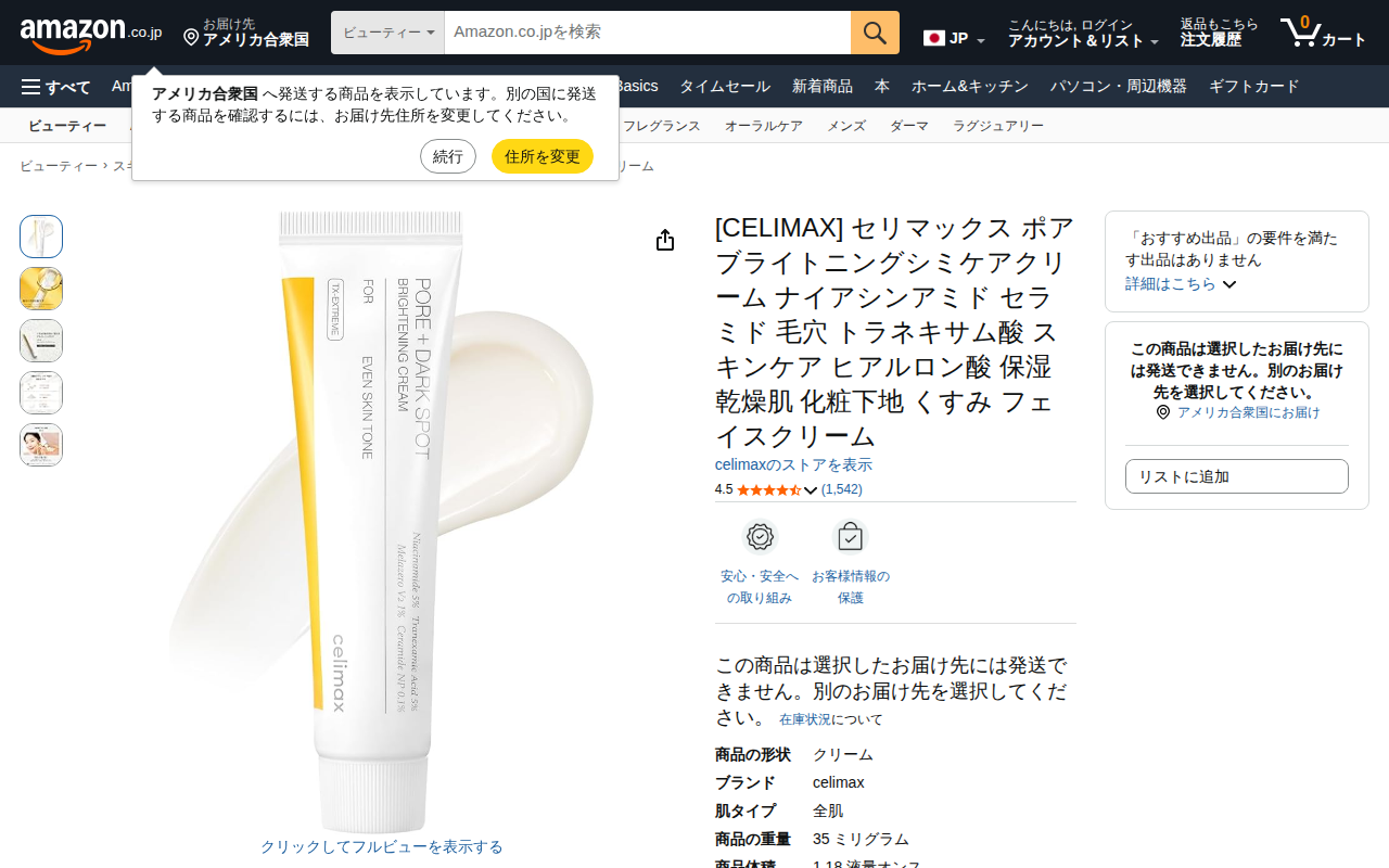 This page displays an Amazon product listing for CELIMAX's Pore Brightening Blemish Care Cream. The product co...