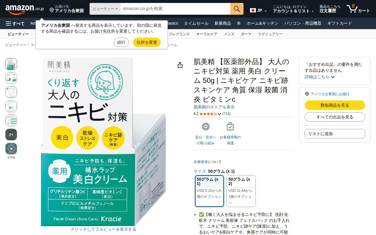 This page presents Hadabisei's medicated whitening cream for adult acne care in a 50g size. The product is des...