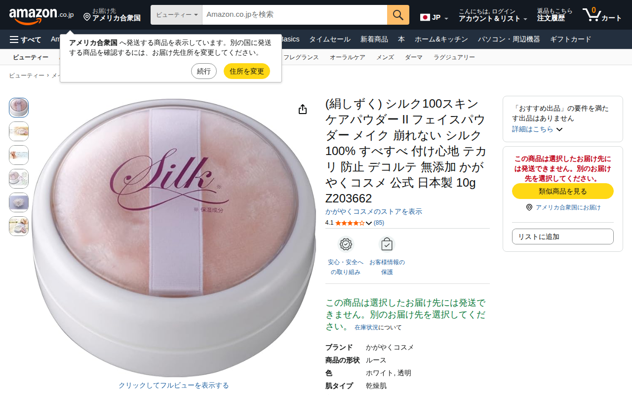 This page is an Amazon product listing for Kagarayaku Cosmetics' Silk 100 Skincare Powder II, a 10g Japanese-m...