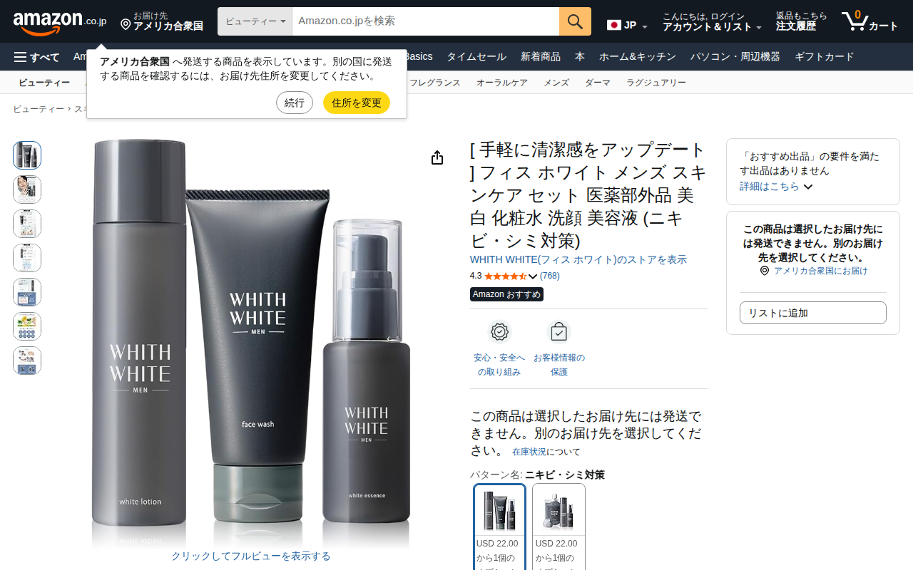 This page presents a men's skincare set "WHITH WHITE" sold on Amazon.co.jp. It is a quasi-drug product approve...