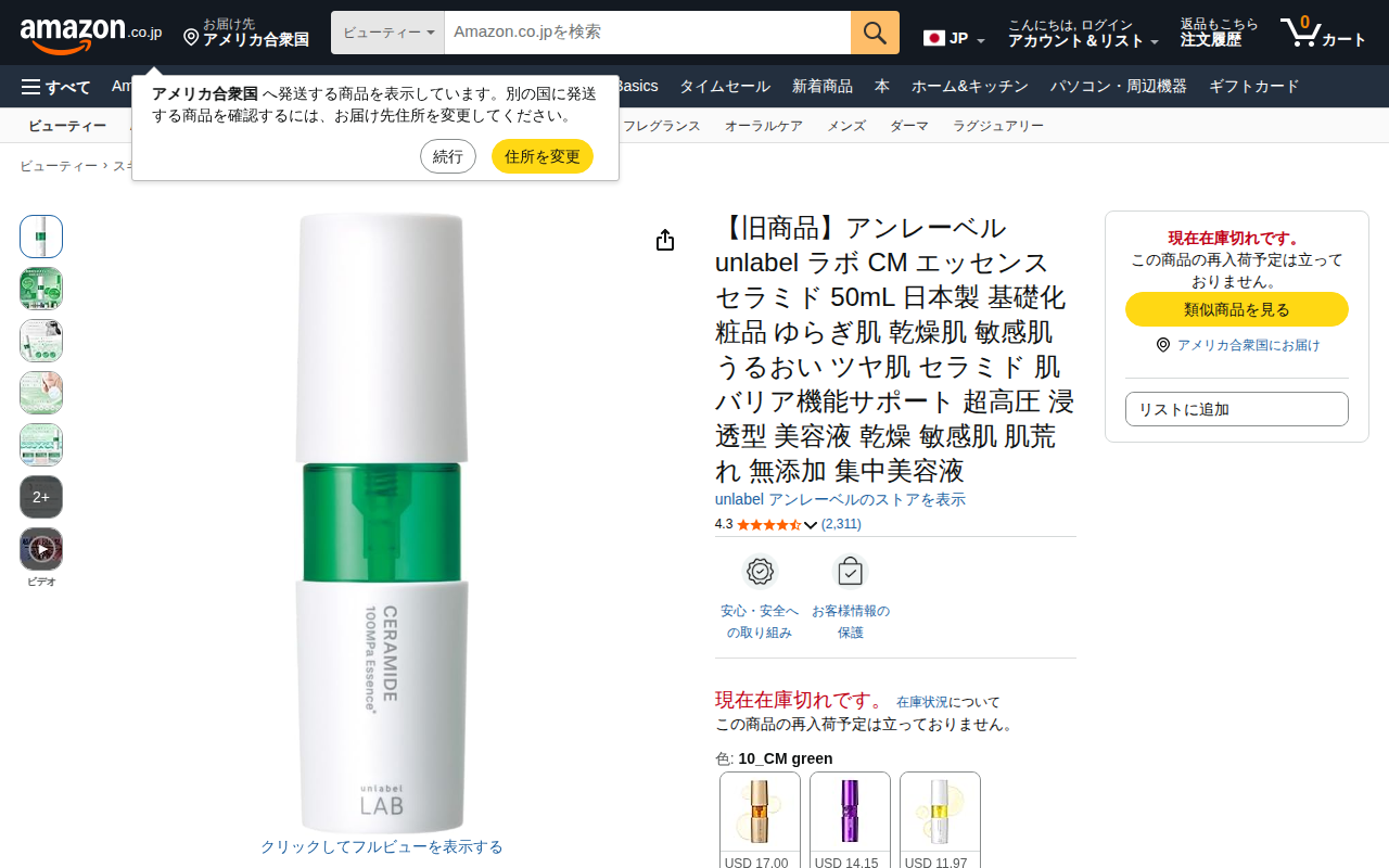This page displays an Amazon product listing for "unlabel V Essence" beauty serum, a 50mL essence-type treatme...