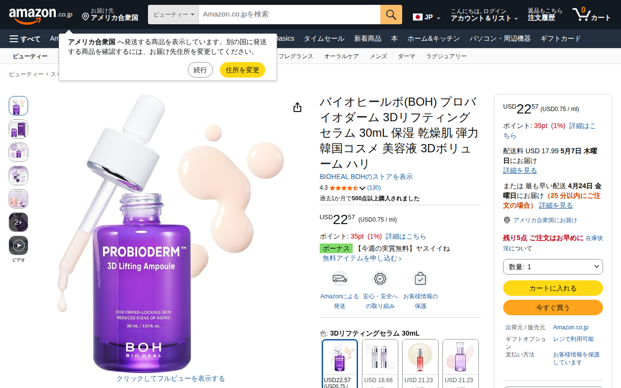 This page presents the BIOHEAL BOH ProBioderm 3D Lifting Serum, a 30mL Korean beauty essence priced at USD 22....