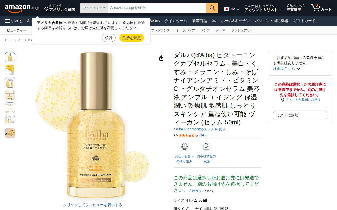 This page features the d'Alba Vita-Toning Capsule Serum (50ml) sold on Amazon.co.jp. The serum contains 40,000...