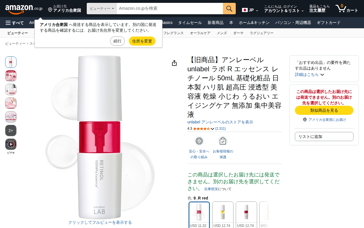 This page presents the unlabel Lab R Essence Retinol Serum (50mL), a Japanese beauty essence infused with reti...