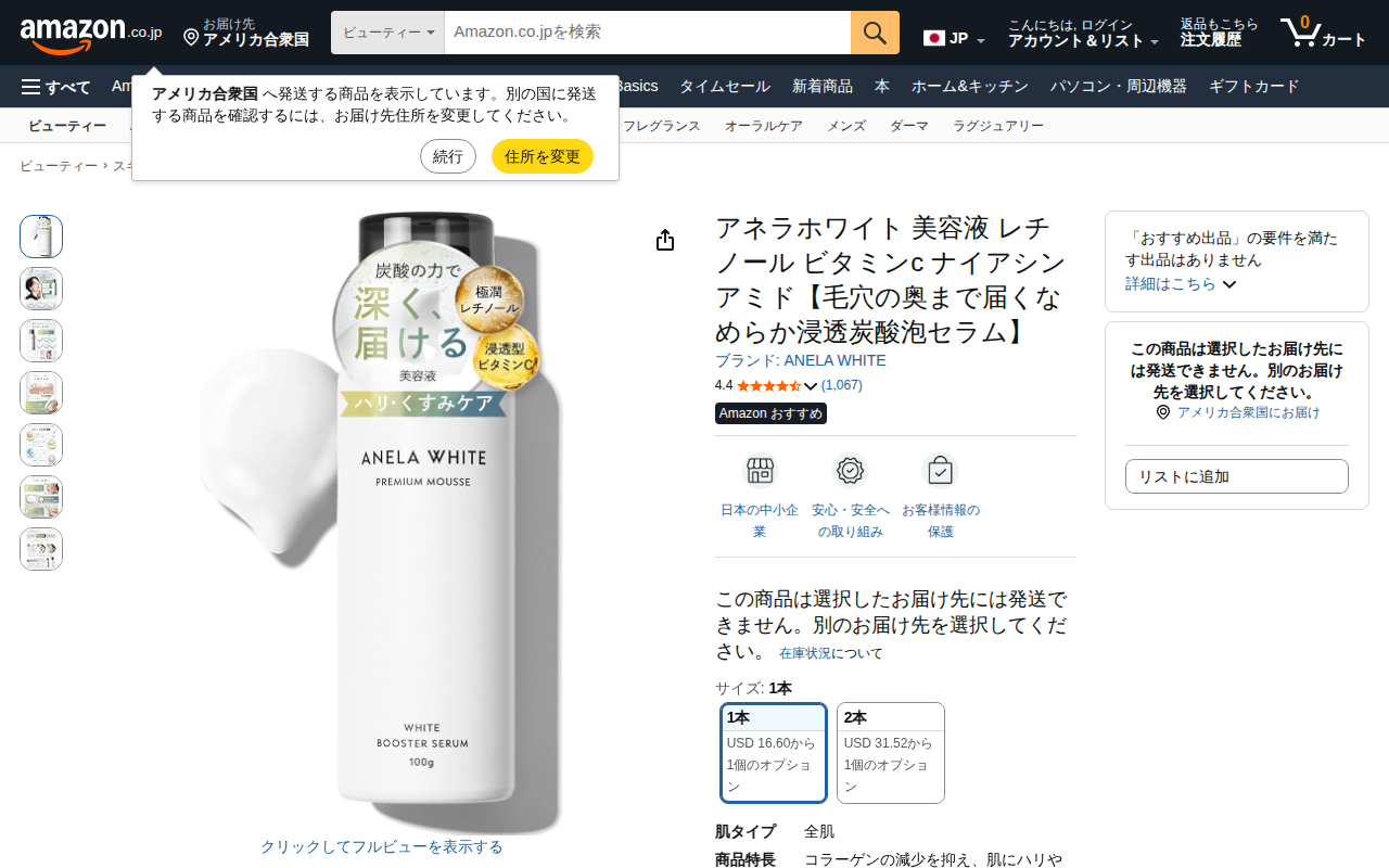 This page showcases the ANELA WHITE carbonated foam serum on Amazon, a beauty essence containing retinol, vita...