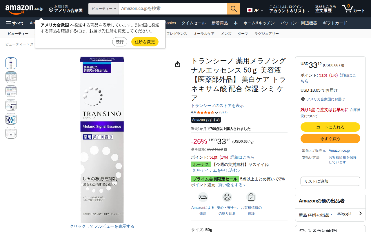 This page is an Amazon.co.jp product listing for Tranexamic Acid Melanosignal Essence, a 50g whitening serum. ...