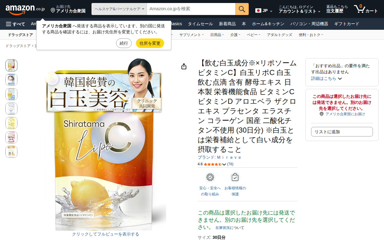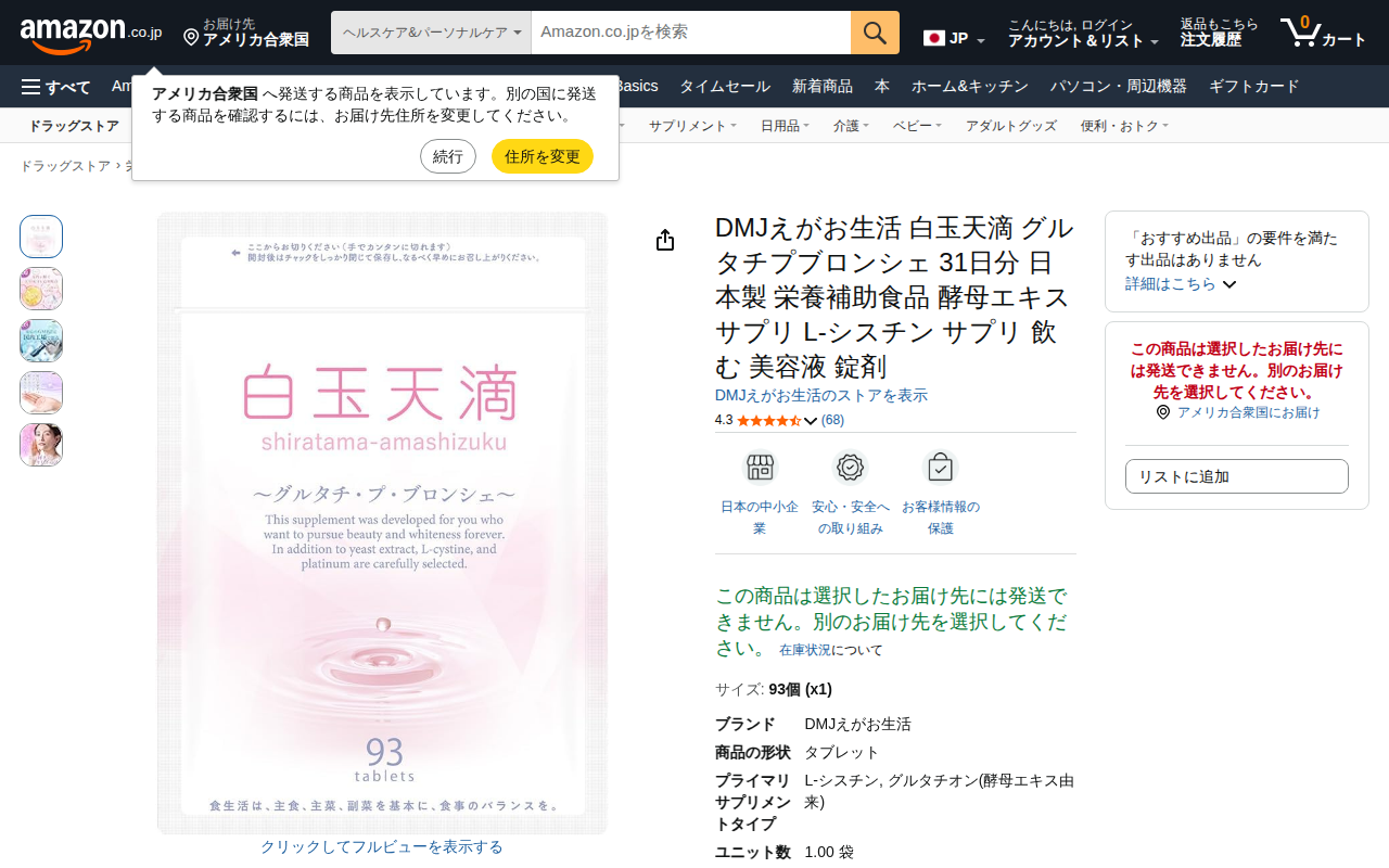 This page presents the DMJえがお生activity White Pearl Gluthacion supplement (31-day supply) on Amazon Japan. It's...