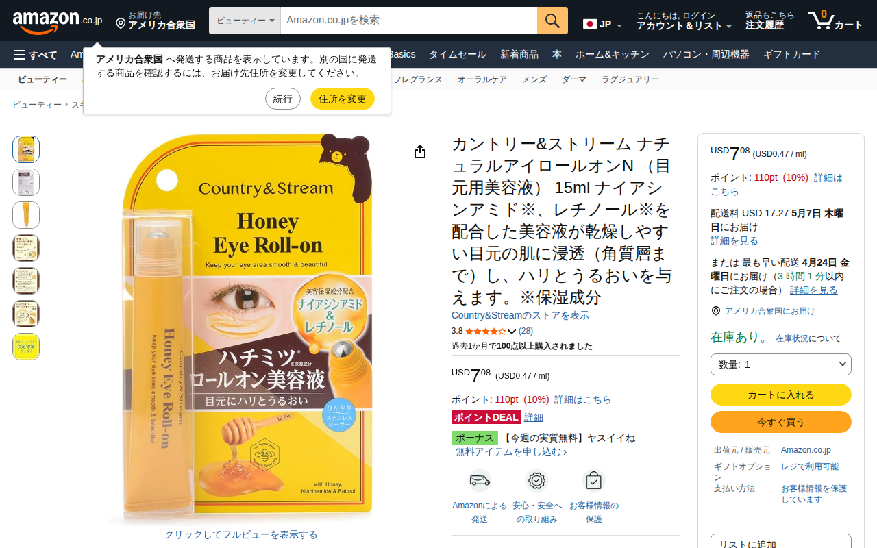 This page is an Amazon.co.jp product listing for Country&Stream Natural Eye Roll-On N, a 15ml eye area beauty ...