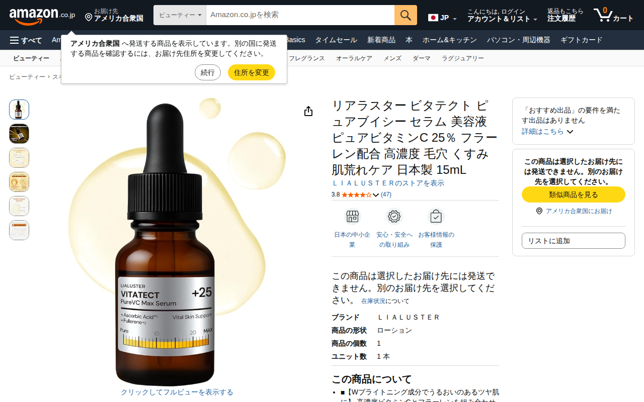 Amazon | リアラスター ビタテクト ピュアブイシー セラム 美容液 ピュアビタミンC 25% フラーレン配合 高濃度 毛穴 くすみ 肌荒れケア 日本製 15mL | LIALUSTER | 美容液 通販
