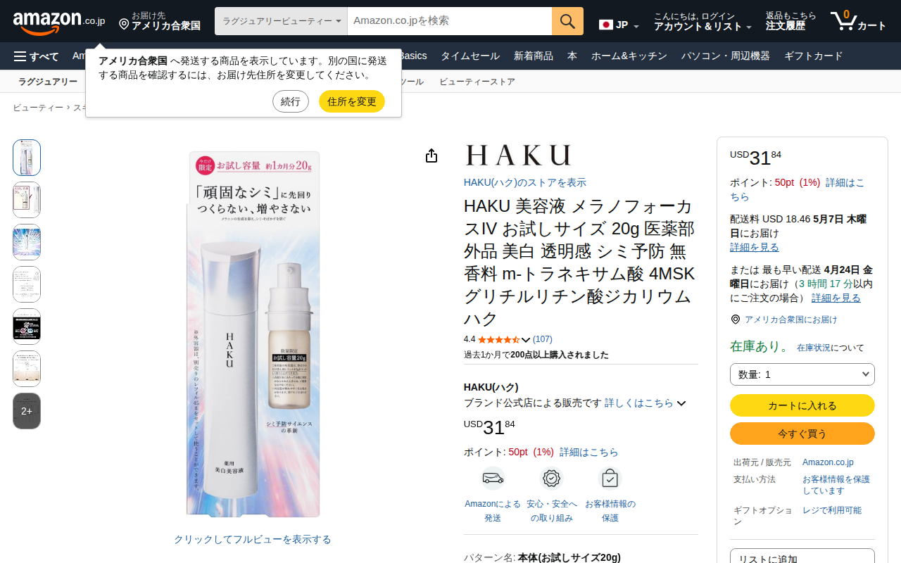 This page showcases HAKU's Melanofocus IV beauty serum in a trial size of 20g on Amazon.co.jp. It is a quasi-d...
